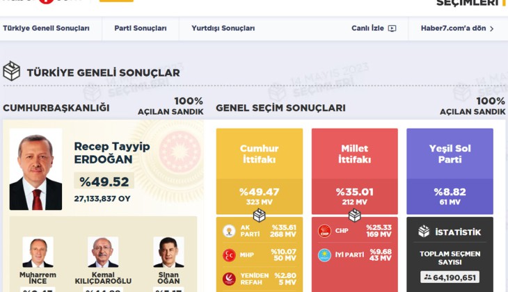به گزارش تارنمای تی.آر.تی خبر، بر اساس نتیجه قطعی اعلام شده، در این دور انتخابات، ۵۲ میلیون و ۹۷۳ هزار رای صحیح شمارش شده و حدود یک میلیون و ۲۱ هزار رای نیز نامعتبر و باطله بوده است.